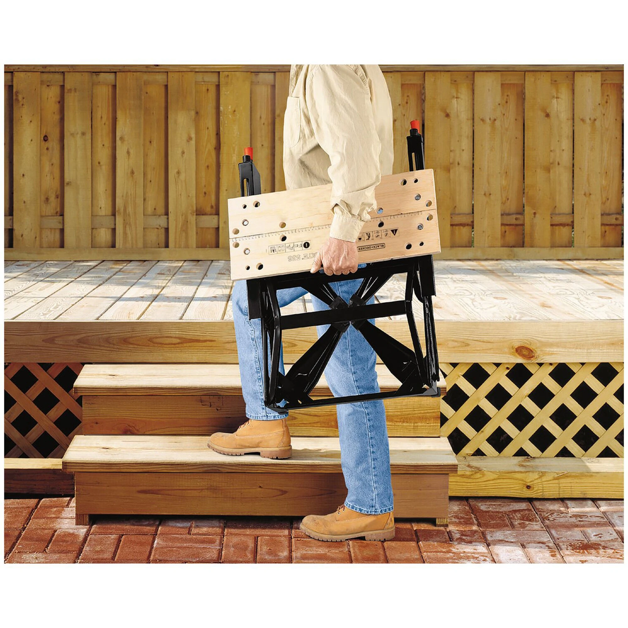 Die Werkbank Workmate WM536 von BLACK+DECKER besteht aus einer massive Stahlkonstruktion, die bis 250kg belastbar ist. Sie bietet zwei einstellbare Arbeitshöhen, 775mm und 595mm. Die verstellbaren Spannbacken und Klemmelemente bieten vielseitige und sichere Einspannmöglichkeiten.
