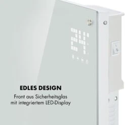Früh morgens beim Zähneputzen oder nach dem Wannenausstieg umfängt den Körper wohlige Wärme, denn das Glaspanel des Klarstein Bornholm Smarts ist mit IP24 spritschutzsicher und kann dementsprechend auch in Feuchträumen aufgestellt werden. Durch sanfte Berührungen des Displays erfüllt das Heizgerät zuverlässig die Wünsche des Wäremsuchenden. Tief im Sofa eingesunken, muss die gemütliche Kissenlandschaft aber nicht verlassen werden, denn die Fernbedienung erlaubt die Bedienung aus der Mulde des Federkerns.