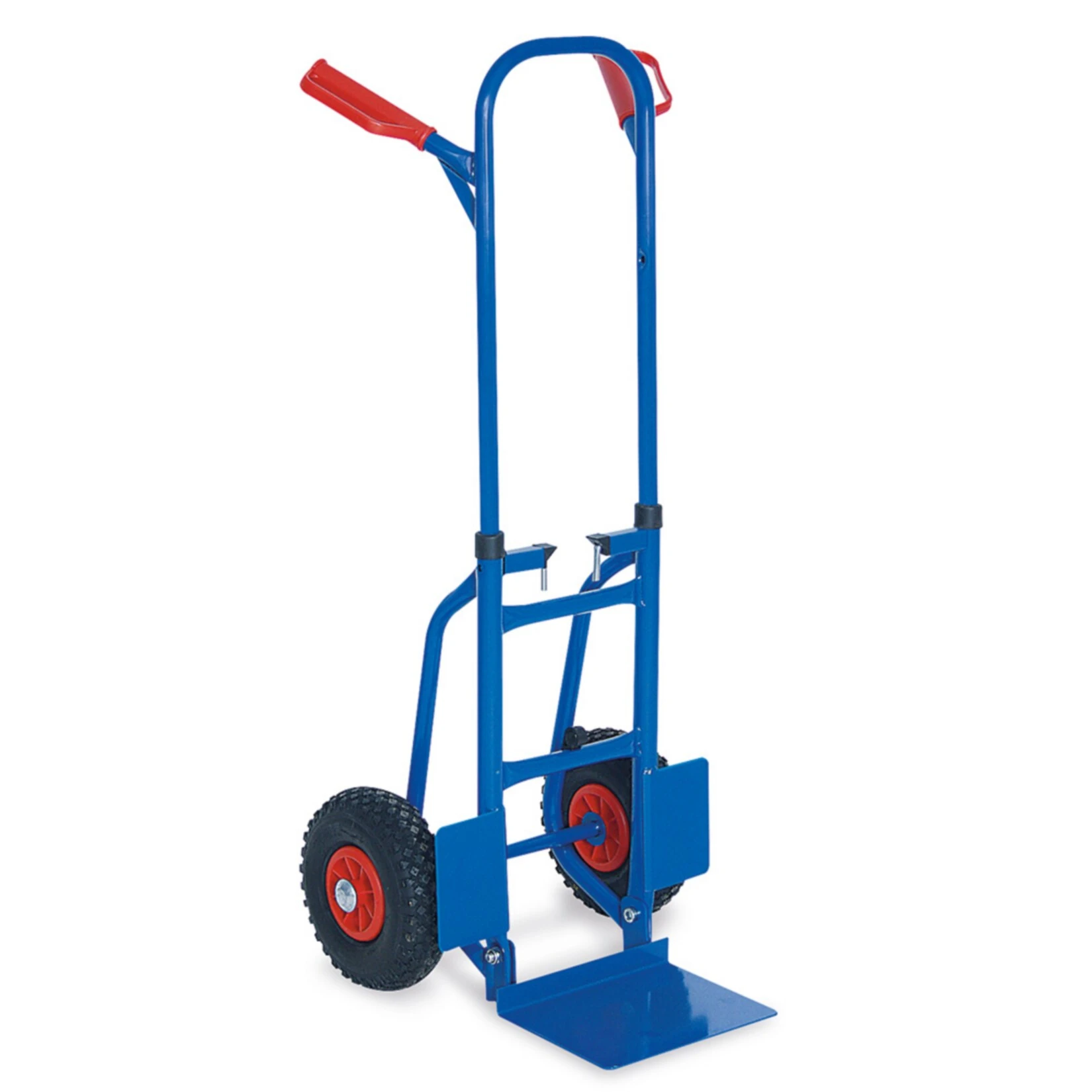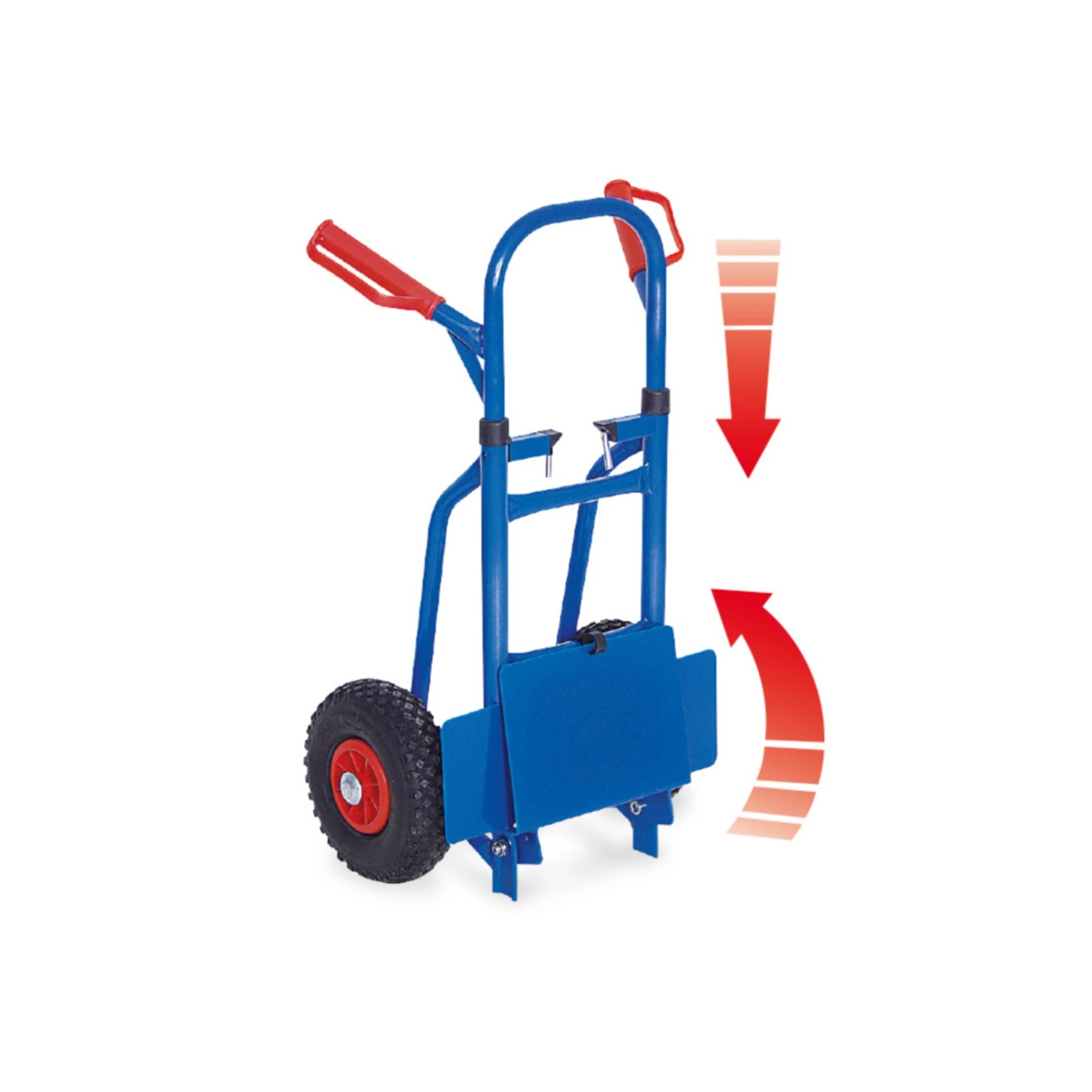 Sie besteht aus einer Stahlrohr-Konstruktion, ist kunststoffbeschichtete und es gibt sie in blau mit roten Sicherheitsgriffen und Handschutzbügeln aus hochfestem Kunststoff. Die Karre ist mit einem Radschutz und pannensicheren Reifen ausgestattet.