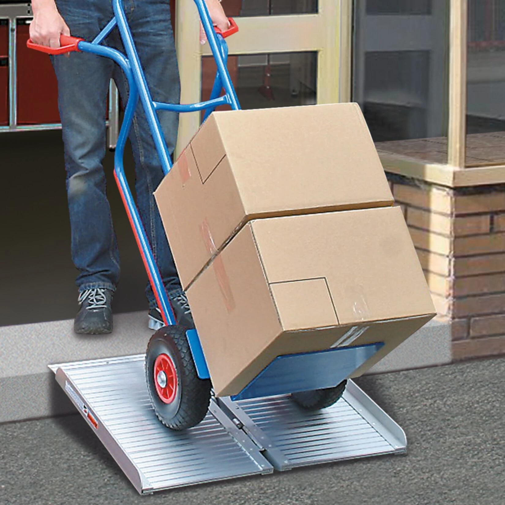 Die BRB Alu-Klapprampe macht den Transport schwerer Artikel mit einer Sackkarre sogar an Treppenstufen, Bordsteinkanten und anderen Erhöhungen kinderleicht.