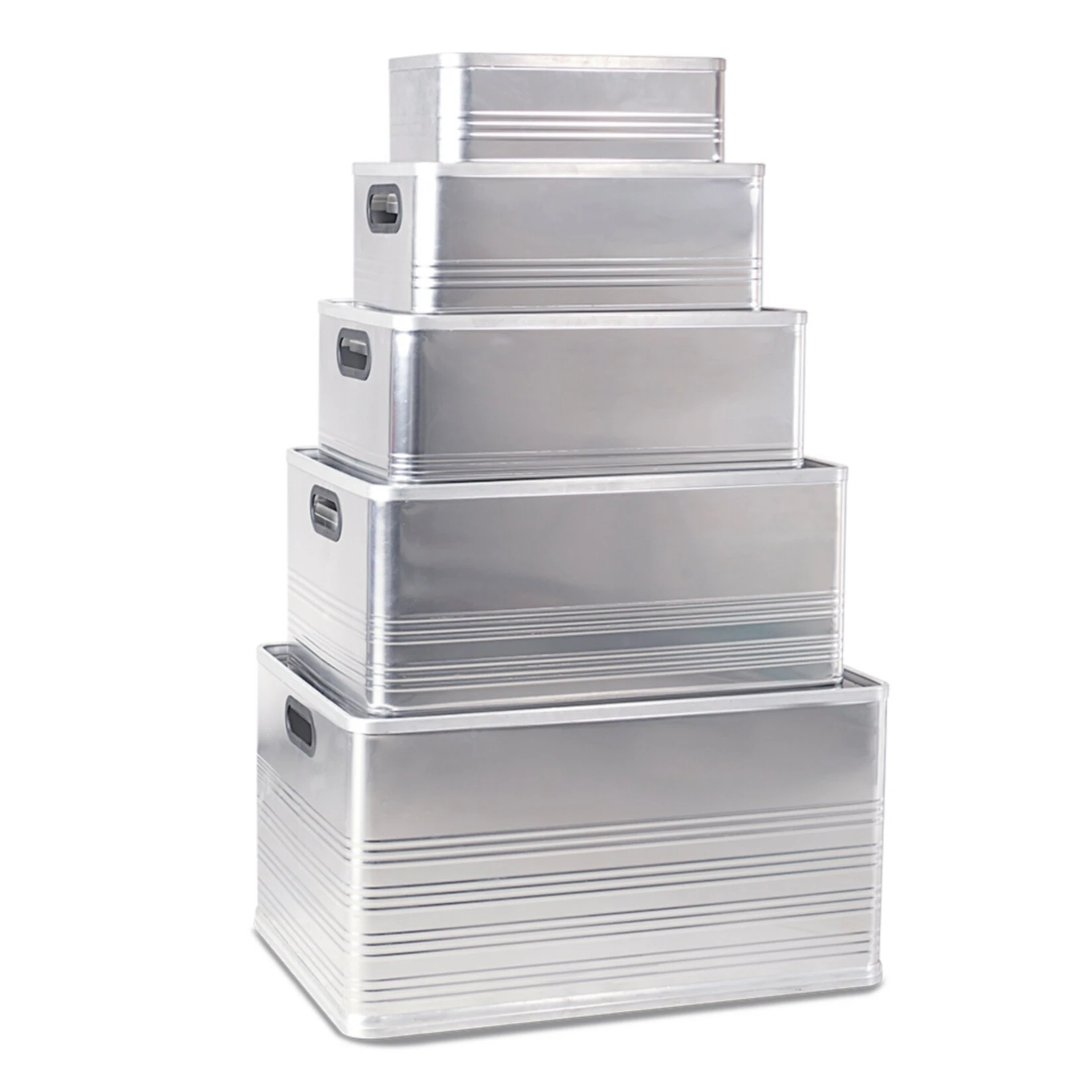 Das Set enthält: 1x 14, 1x 29 Liter, 1x 50 Liter, 1x 79 Liter und 1x 118 Liter Aluminium-Kasten. Die Kästen sind größenmäßig stapelbar.