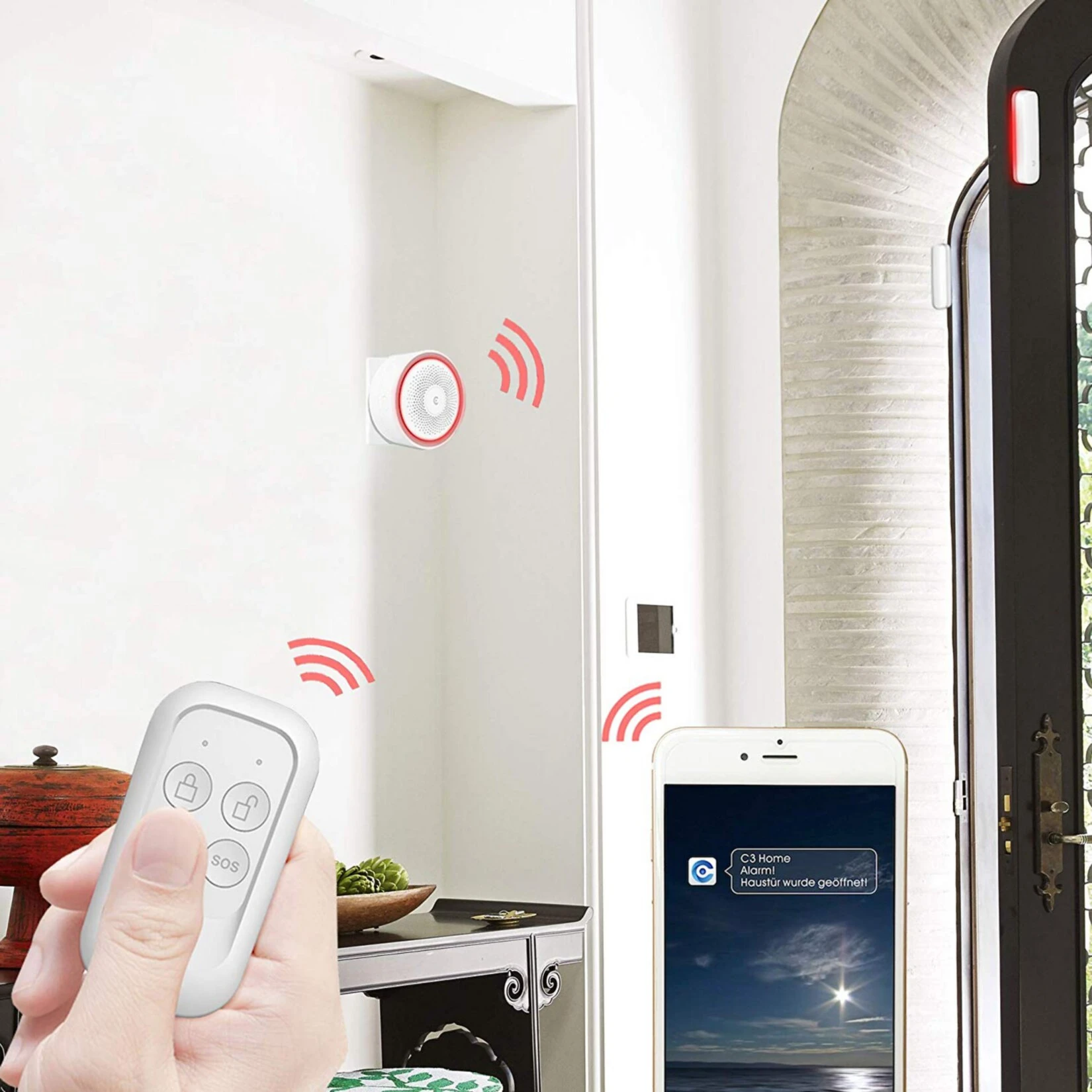 Die integrierte Sirene lässt mit Ihrer Sirenenlautstärke von 90 dB möglicherweise unbefugte Personen umgehend flüchten.