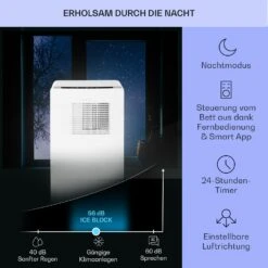 Die Klarstein Iceblock Ecosmart 9 mobile Klimaanlage sorgt für das perfekte sommerliche Wohlfühlklima in Wohn- oder Arbeitsräumen. Ihr leistungsstarker Kühlkompressor arbeitet mit 9.000 BTU bzw. 2,6 kW in der Energieeffizienzklasse A, sodass das Gerät auch im Dauerbetrieb angenehm sparsam und umweltfreundlich bleibt. Dabei hebt es sich mit 3-in-1-Effizienz als Klimaanlage, Ventilator und Luftentfeuchter deutlich hervor und kühlt an heißen Tage Innenräume zwischen 26 und 44 m² auf angenehme Temperaturen zwischen 16 und 31 °C. Der integrierte Ventilator verteilt mit 2 Leistungsstufen die gekühlte Luft zuverlässig im gesamten Raum, während die Entfeuchtungsfunktion in einer Stunde bis zu 1 l Feuchtigkeit aus der Luft filtert.