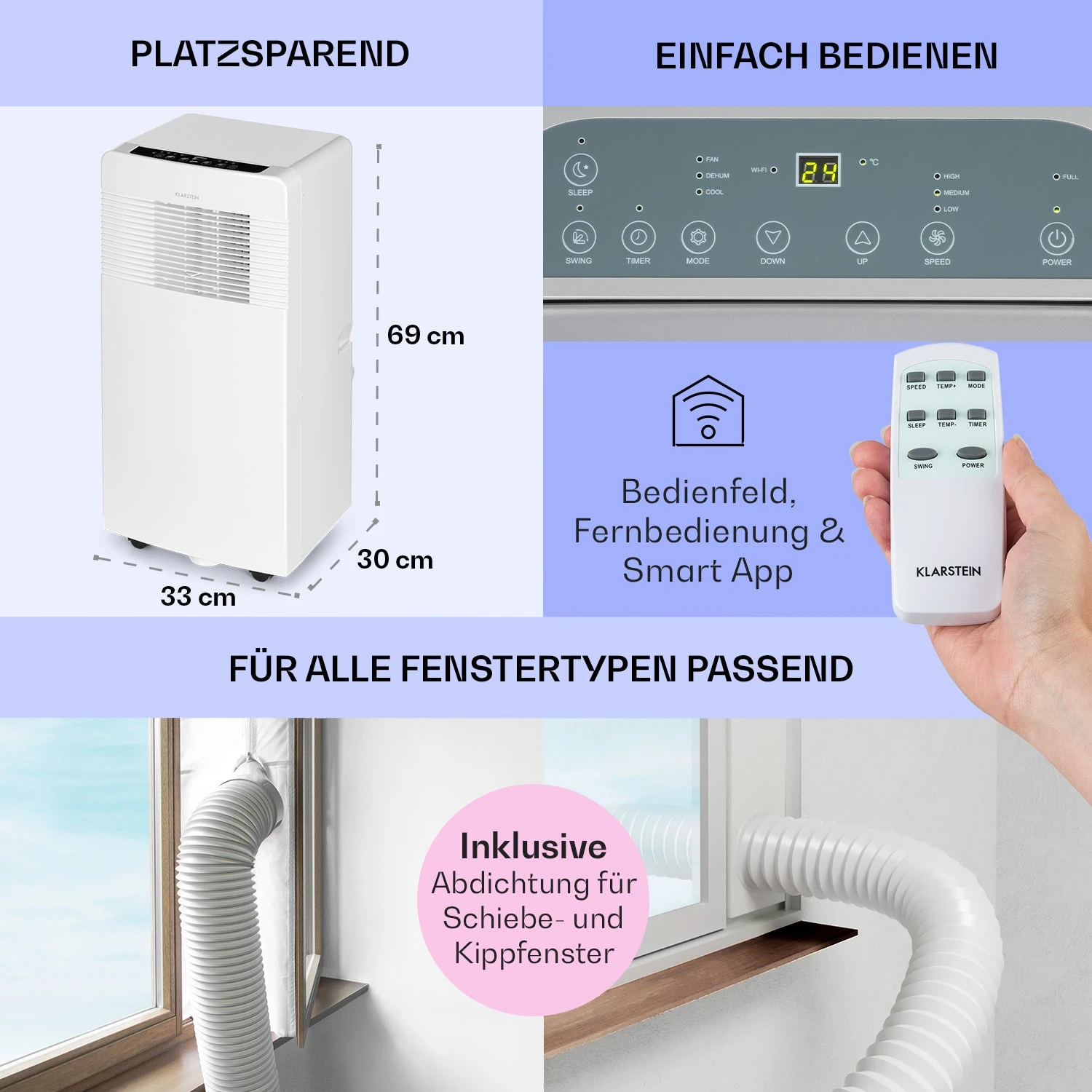 Klarstein Iceblock Ecosmart 9 mobile Klimaanlage | 3-in-1: Kühlung, Entfeuchtung, Ventilation | Energieeffizienzklasse A | 9.000 BTU / 2,6 kW | WiFi: Steuerung per App | Raumgröße: 26 bis 44 m² | 4 Bodenrollen | Timer-Funktion | Fernbedienung | inkl. Fensterabdichtungsset & Abluftschlauch | weiß
