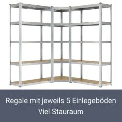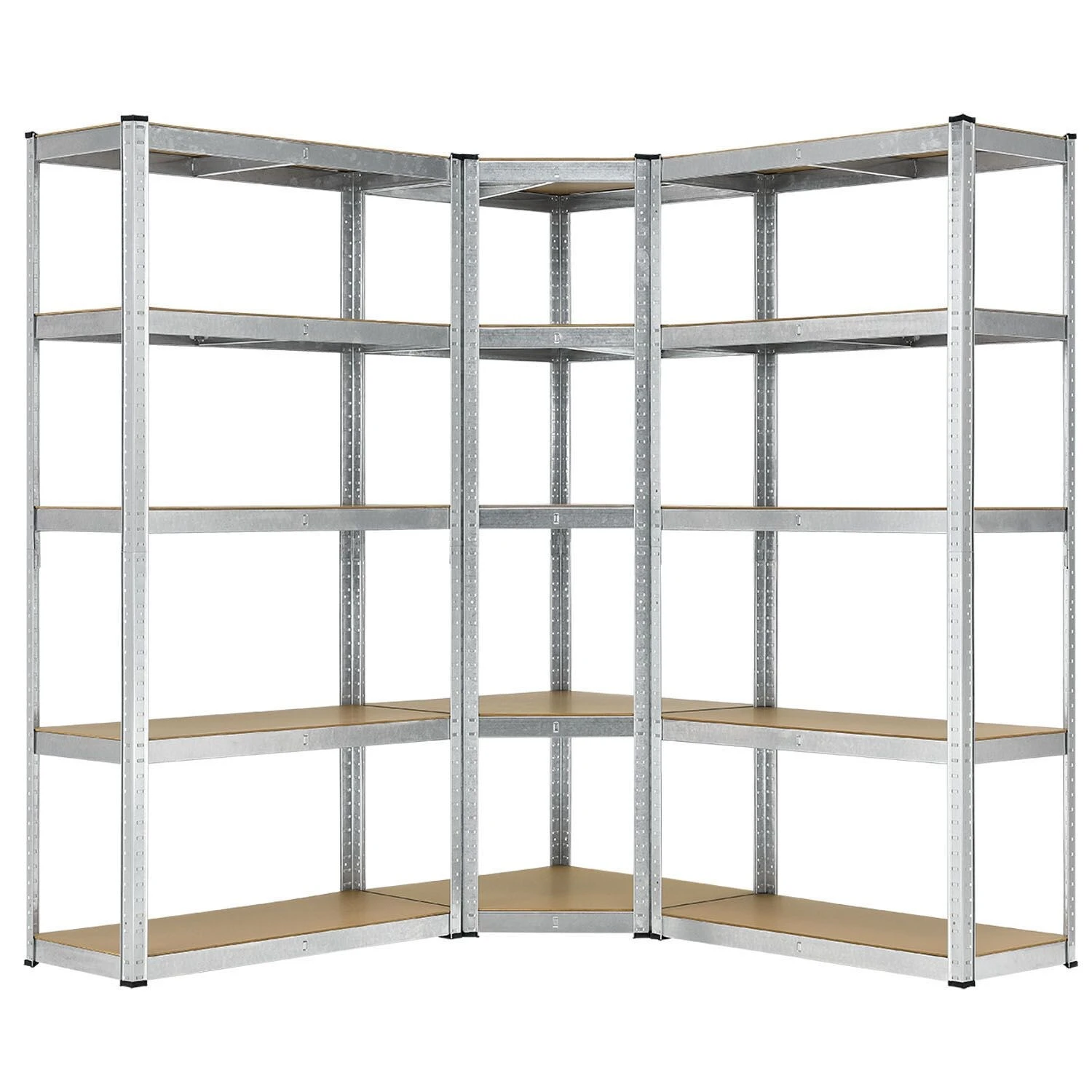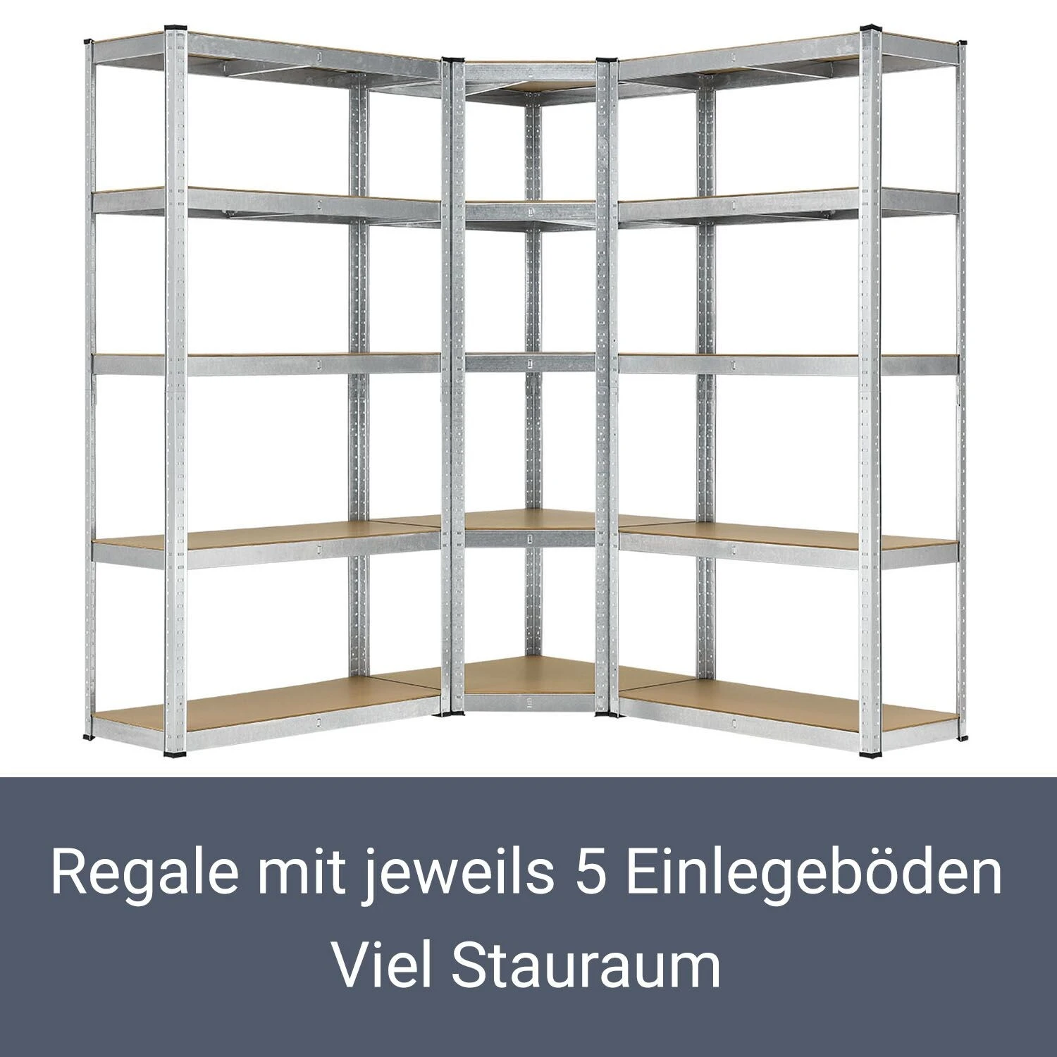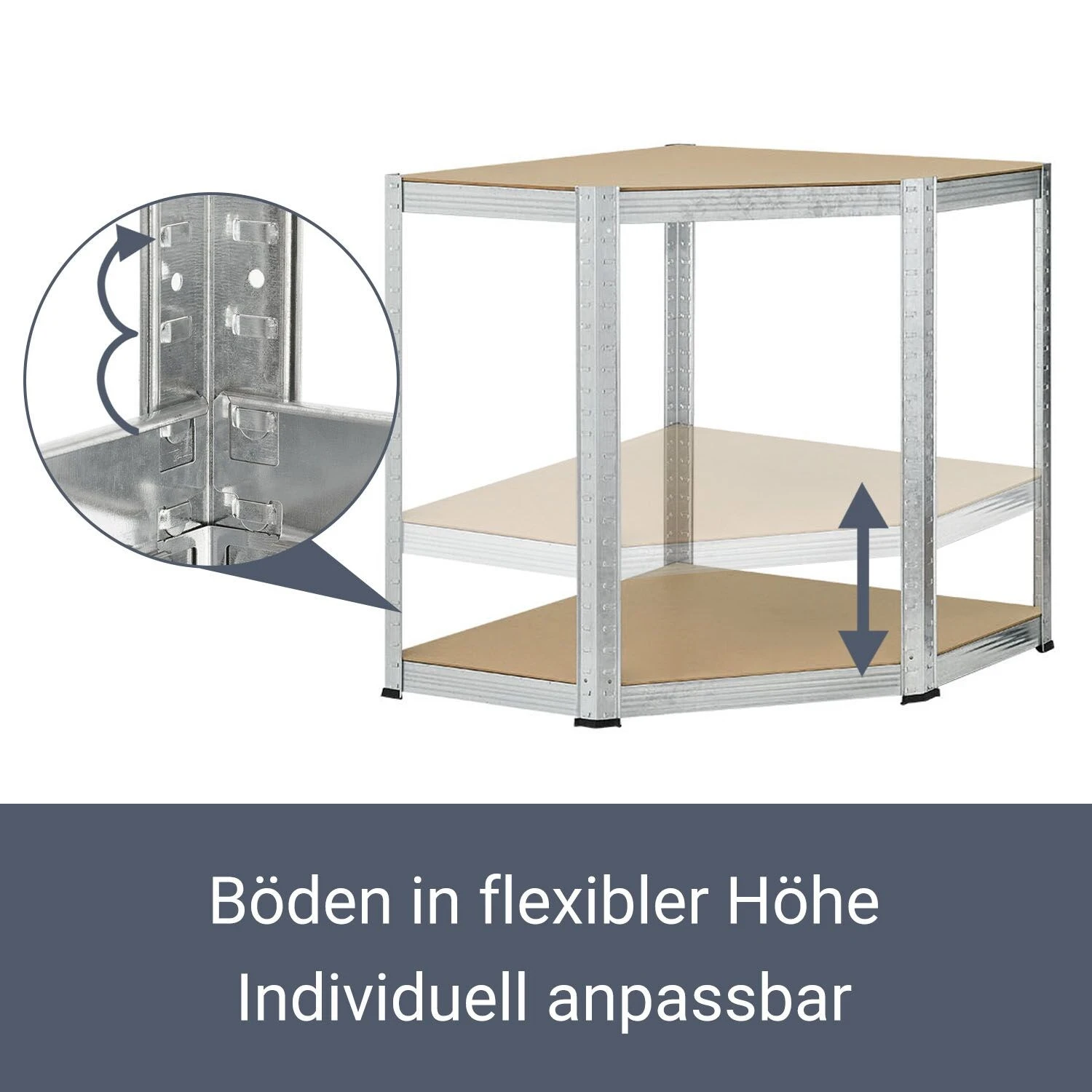 Ob Keller, Garage, Werkstatt oder Abstellkammer â mit dem praktischen 3er Regalsystem Basic bringen Sie Ordnung in Ihr Leben. Das Set besteht aus einem 180 Ă 70 Ă 40-70 cm groĂen Eckregal und zwei 180 Ă 90 Ă 40 cm groĂen Schwerlastregalen aus verzinktem Metall. Jedes der drei Kellerregale ist mit jeweils 5 stabilen Einlegeböden ausgestattet. Ideal fĂŒr die Aufbewahrung von Werkzeug, Gartenutensilien, VorrĂ€ten, GetrĂ€nkekisten und anderen GegenstĂ€nden. Das ausgeklĂŒgelte Stecksystem ermöglicht einen schnellen Aufbau ohne Bohren oder Schrauben. Durch die KunststofffĂŒĂe bleibt Ihr FuĂboden vor unschönen Kratzern verschont.