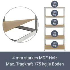 Jeder der 15 Fachböden ist aus 4 mm starkem MDF Holz gefertigt und hat bei gleicher Lastverteilung eine maximale Traglast von 175 kg. Somit betrÀgt die höchstmögliche Gesamt-Belastbarkeit des Kellerregals 2625 kg.