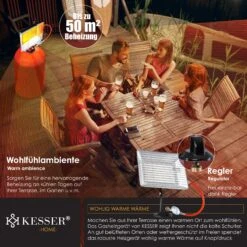 Der KESSER Heizstrahler ist aufgrund seiner hohen Qualität zu einer idealen Wahl für den privaten und gewerblichen Gebrauch geworden. Mit dem eleganten Design, der hochwertigen Verarbeitung und den effizienten Funktionen eignet sich unser Heater sehr gut für den modernen Außenbereich oder die Gastronomie. Dank der angenehmen, sonnenähnlichen Strahlungswärme können Ihre Gäste, Freunde und Familie auch bei feucht–kaltem Wetter draußen sitzen und bis zu 50m² beheizen.