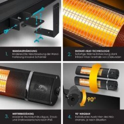 Ein warmes Plätzchen auch im Winter? Gar kein Problem mit dem hochwertigen Infrarot–Heizpilz von KESSER. Durch die einfache und schnelle Montage lässt sich das Heizgerät schnell an der Wand anbringen – so stellt das Gerät keine Gefahr für Kinder oder Haustiere dar. Egal wo sie den Hochleistungs-Heizstrahler anbringen möchten, durch seinen extrem leisen Geräuschpegel, lässt sich die Infrarotheizung überall verwenden. Bei Gesprächen mit Ihren Freunden im Garten können Sie das Gerät laufen lassen ohne dabei gestört zu werden. Optimieren Sie die Einstrahlung der Wärme – unser Strahler ermöglicht individuelles Ausrichten dank 90° Neigungswinkel.