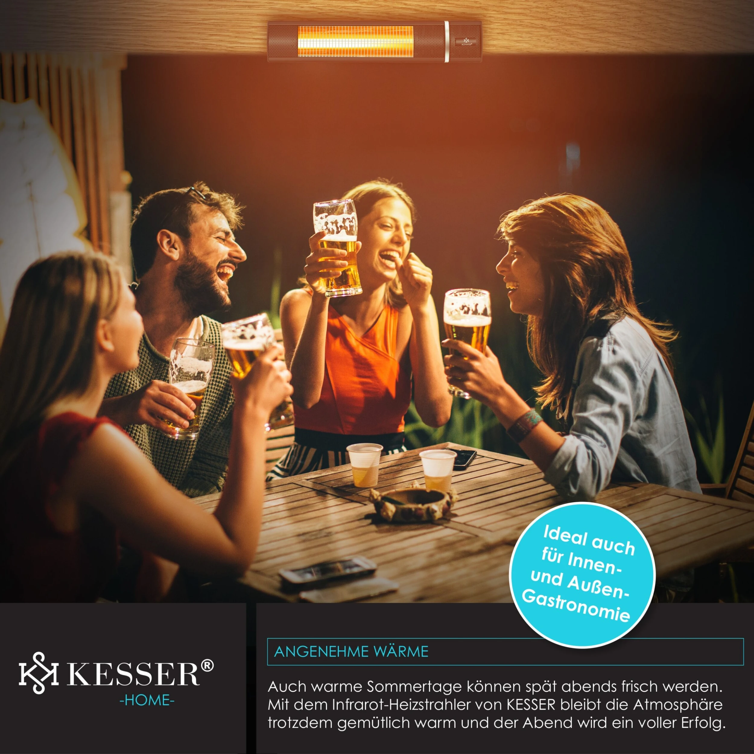 Der KESSER Infrarot–Heizstrahler ist aufgrund seiner hohen Qualität zu einer idealen Wahl für den privaten und gewerblichen Gebrauch geworden. Mit dem eleganten Design, der hochwertigen Verarbeitung und den effizienten Funktionen eignet sich unsere Infrarotheizung sehr gut für den modernen Außenbereich oder die Gastronomie. Dank der angenehmen, sonnenähnlichen Strahlungswärme, können Ihre Gäste, Freunde und Familie auch bei feucht–kaltem Wetter draußen sitzen.