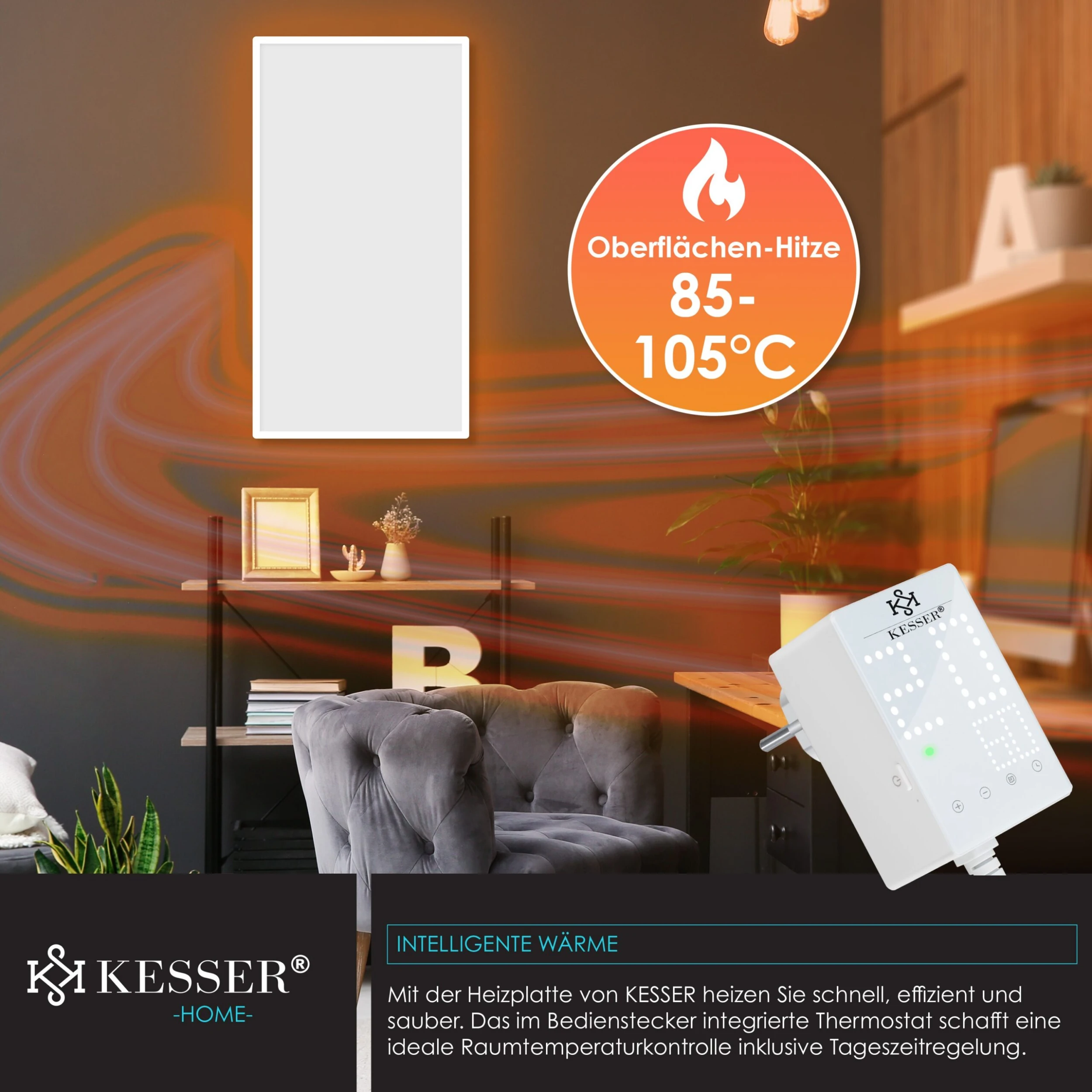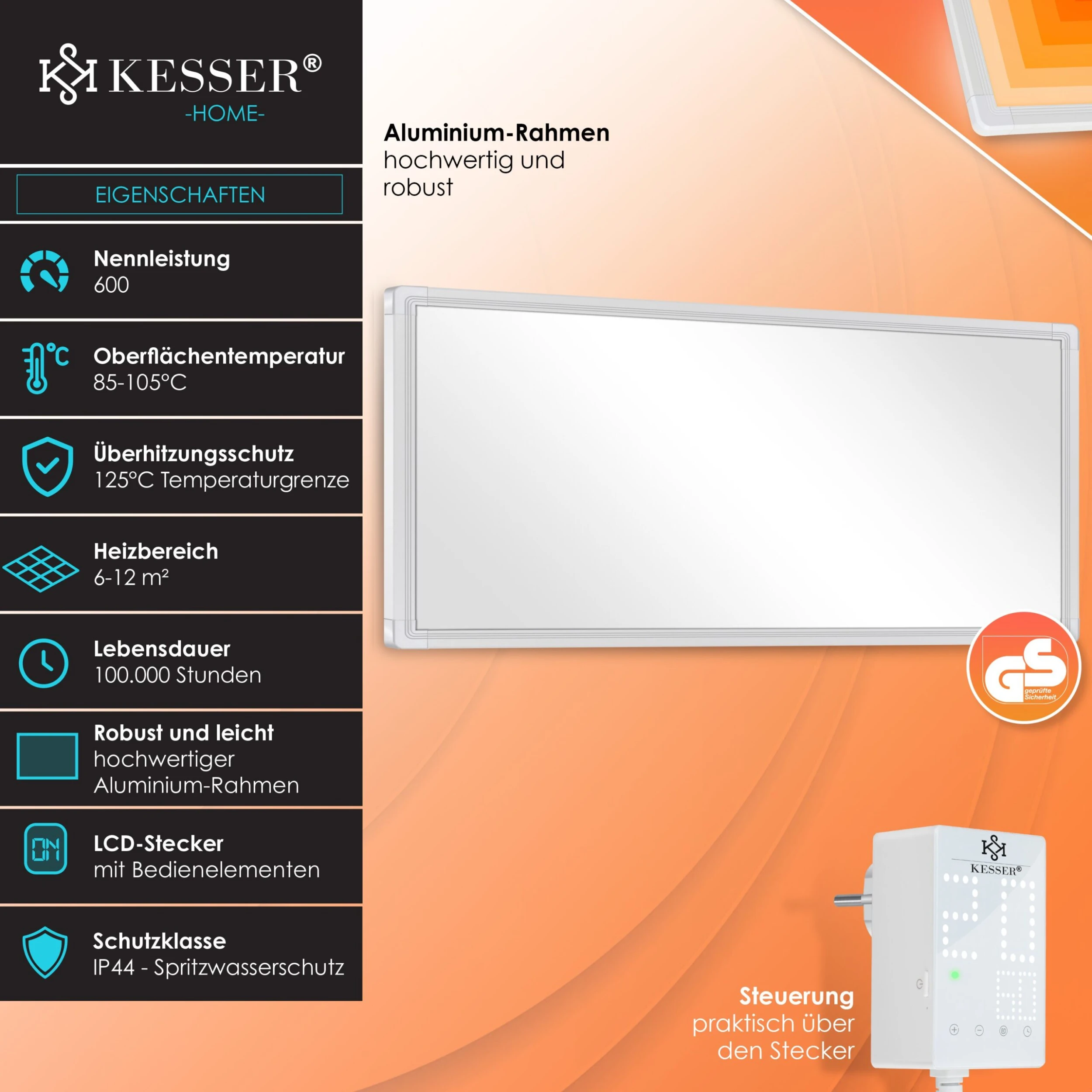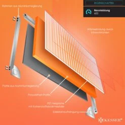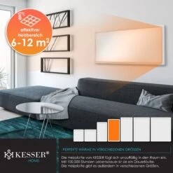 KESSER Infrarotheizung, IP44 Schutzklasse, effizientes Heizen, Spritzwasserschutz, inkl. Thermostat, 28 unterschiedliche Routineprogramme, Open Window DetectionKESSER – Einfach BESSER durch den Winter!Gerade Bewohner unter uns mit Altbauten oder höheren Decken kennen das Problem: Es kostet ungemein viel Zeit und Geld, bis die eigene Heizung eine angenehme Temperatur im Raum spendet. Die Ursache dafür ist die physikalische Gesetzmäßigkeit, dass warme Luftmassen aufsteigen. Ein herkömmlicher Heizkörper wärmt den Raum also unnötig von oben nach unten, dabei sammelt sich die Wärme erst einmal nutzlos unter der Decke – eine nicht zu unterschätzende und teure Energieverschwendung.Eine Infrarotheizung kann heutzutage als Ersatz für eine Ölheizung, für eine Gasheizung oder für viele weitere Heizsysteme zum Einsatz kommen. Herkömmliche Heizungen erwärmen laut Testbericht sehr schlecht, denn die Wärme steigt einfach nur nach oben und wirbelt dabei unnötigen Staub und Schmutz auf.Stattdessen erwärmt unsere Infrarotwandheizung Lebewesen sowie Gegenstände, auf welche die infrarote Strahlung in unmittelbarer Nähe stößt. So kann unsere innovative Heizung beispielsweise Möbel, Böden, Wände, Menschen sowie Tiere erwärmen. Dabei ist die Vorheizzeit vergleichsweise zu herkömmlichen Heizgeräten ziemlich kurz und somit deutlich energiesparender. Unser Heizsystem ist einfach die perfekte Lösung für einen schnelllebigen Alltag. Zertifiziert mit einer IP44 Schutzklasse und einem GS- Prüfzertifikat wird Ihnen ein optimaler Schutz garantiert. Zusätzliche Sicherheit gewährt Ihnen ein zweifacher Überhitzungsschutz, somit schaltet sich unser Ofen im Notfall ab und ein Befeuern ist nicht möglich.Die hochwertige Produktion gewährt neben der Funktion auch ein langlebiges und hochwertiges Heizsystem. Für die Wärmebildung durch die Infrarotstrahlen sorgen diverse Platten, welche von dem Rahmen aus einer Aluminiumlegierung gehalten werden. Aufgebaut durch eine Platte aus Aluminiumlegierung, einer Polyurethan-Platte und einer PET-Heizplatte mit Kohlenstoffkristall-Heizfolie wird Ihnen die bestmögliche Wärmeentwicklung garantiert. Variante Steckdosenthermostat: Dank des integrierten Steckdosenthermostats wird Ihnen ermöglicht die gewünschte Temperatur einzustellen. Unser Heizkörper überzeugt durch 28 unterschiedliche Routineprogramme, diese können Sie je nach Wunsch automatisch oder auch manuell nutzen. Legen Sie neben der Temperatur einen gewünschten Zeitraum inklusive der Stärke fest. Zusätzlich stehen Ihnen viele Steuerungsoptionen zur Verfügung. Sie können per Knopfdruck ganz leicht die Temperatur erhöhen oder auch senken. Wählen Sie aus 28 verschiedenen Programmen das für Sie abgestimmte Programm aus und genießen Sie die Wärme. Ein integriertes Thermostat misst die Temperatur für Sie mit und gibt Ihnen in Echtzeit die aktuelle Temperatur vor. Über einen einfachen Knopfdruck können Sie auch Ihre Wunschtemperatur bis zu 60°C einstellen, sollte dabei unbemerkt einmal das Fenster offen stehen, besteht kein Grund zur Sorge. Denn mit unserer innovativen und energiesparenden “Open Window Detection” schaltet sich das Heizsystem bei einem offenen Fenster ab. Sie haben einen gewissen Tages- bzw. Wochenryhtmus? Dann nutzen Sie unsere zwei Heizperioden die sich auf 7 Tage programmieren lassen.Variante Fernbedienung: Dank der mitgelieferten Thermostat Fernbedienung wird Ihnen ermöglicht, die gewünschte Temperatur einzustellen. Unser Heizkörper überzeugt durch 28 unterschiedliche Routineprogramme, diese können Sie je nach Wunsch automatisch oder auch manuell nutzen. Legen Sie neben der Temperatur einen gewünschten Zeitraum inklusive der Stärke fest. Zusätzlich stehen Ihnen viele Steuerungsoptionen zur Verfügung. Sie können per Knopfdruck ganz leicht die Temperatur erhöhen oder auch senken. Wählen Sie aus 28 verschiedenen Programmen das für Sie abgestimmte Programm aus und genießen Sie die Wärme. Ein integriertes Thermostat misst die Temperatur für Sie mit und gibt Ihnen in Echtzeit die aktuelle Temperatur vor. Über einen einfachen Knopfdruck können Sie auch Ihre Wunschtemperatur bis zu 60°C einstellen, sollte dabei unbemerkt einmal das Fenster offen stehen, besteht kein Grund zur Sorge. Denn mit unserer innovativen und energiesparenden “Open Window Detection” schaltet sich das Heizsystem bei einem offenen Fenster ab. Sie haben einen gewissen Tages- bzw. Wochenryhtmus? Dann nutzen Sie unsere zwei Heizperioden die sich auf 7 Tage programmieren lassen.Sparen Sie bares Geld mit unseren Steuerungsmöglichkeiten. Heizen Sie Ihre Räume nur dann, wenn es nötig ist. Durch flexibles Steuern haben Sie die Möglichkeit, Ihre vier Wände effizient zu wärmen. Für Ihre unterschiedlich großen Räumlichkeiten ist die Heizung aus dem Hause KESSER mit Leistungen zwischen 300 und 1.200 Watt zu haben. Damit eignet sich der Radiator mit einer Oberflächentemperatur zwischen 85-105°C ideal für größere und kleinere Räume. Der Radiator lässt sich zudem in Gartenhäusern und Wintergärten installieren, so steht auch Ihrer nächsten Gartenparty im Winter nichts mehr im Weg. Wer kennt es nicht? Man kommt an kalten Wintertagen aus der Dusche und der Raum ist eiskalt, denn das Badezimmer wird statistisch gesehen am wenigsten beheizt. Kein Grund zur Sorge, mit unserem innovativen Wärmestrahler betreten Sie nach dem Duschvorgang einen mollig warmen und angenehmen Raum. Und die Elektrik im Bad? – Selbst dafür haben wir gesorgt! Mit unserem Spritzwasserschutz sind Sie auch hier auf der sicheren Seite, denn die Elektroheizung schaltet sich bei Kontakt mit Wasser direkt ab.Ein weiterer Vorteil besteht in der Flexibilität, wechseln Sie die Heizsonne an Ihren Wunschort, wenn Sie es gebrauchen. Unsere Heizung heizt problemlos Räume bis zu 24 Quadratmetern, aber auch kleine Räume ab 3 Quadratmetern lassen sich mit unserm Radiator bestens ausstatten. Und auch optisc