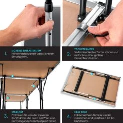 Ein grundlegender Vorteil unseres Tapeziertisches liegt in seiner robusten und stabilen Standsicherheit, welche durch die hochwertigen Verstrebungen verstärkt wird. Verwenden Sie den Buffettisch als Ablage, die wirklich standhält. Drei Tische können Sie verteilt mit 90 Kg belasten – Ideal für die nächste Gartenparty! Denn auch durch die Materialien Aluminium, Stahl und MDF erhalten Sie eine stabile und langlebige Konstruktion, die wetterbeständig ist und somit windigen oder regnerischen Tagen Stand hält.
