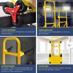 Die Treppenkarre ist bis 200 kg belastbar und überwindet Treppen und Bordsteinkanten. Ideal geeignet für Verladearbeiten, Lieferungen, Umzüge, aber auch für den anspruchsvollen Heimwerker im Garten oder Haus. Unsere Sackkarren baus einem robusten Stahlrohr–Rahmen, die Sicherheitsgriffe sind aus festem Kunststoff. Durch die 3-fach Sternräder ist das Treppensteigen extrem standfest.
