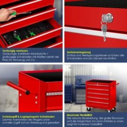 Aus dem Hause Masko® bieten wir Ihnen hier den optimalen Ordnungshalter für Ihre Werkstatt an. Mit diesem schicken, variablen und kompakten Werkstattwagen können Sie Ihr Werkzeug optimal und effizient sortieren. In jeder Schublade finden Sie ausreichend Platz. Dank der Anti-Rutschbeschichtung bleibt alles an seinem Platz und Sie haben kein pausenloses „Klackern“, wenn Sie den Wagen von „A nach B“ schieben. Um den Werkstattwagen ohne Probleme z.B. zu einer weiter entfernten Baustelle bringen zu können, lassen sich mittels eines zentralen Verschlussmechanismus alle Schubladen auf einmal sperren. Durch die stabilen, 40mm breiten und 120 mm großen Räder kann der Werkstattwagen ideal und präzise rangiert werden. Da nicht jedes Werkzeug unmittelbar in den Wagen zurück muss, können Sie dies auf der robusten und kratzfesten Arbeitsplatte (durch eine Anti-Rutschmatte) ablegen.