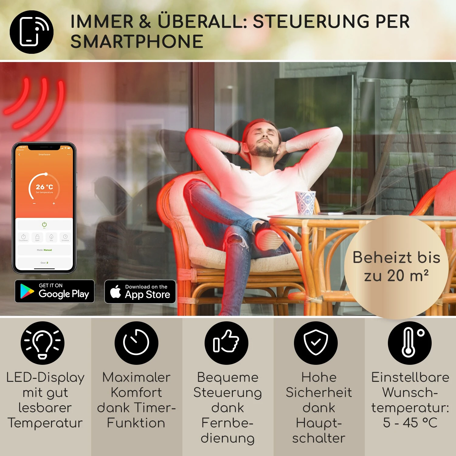 - geeignet zur Erwärmung von bis zu 20 m² Fläche