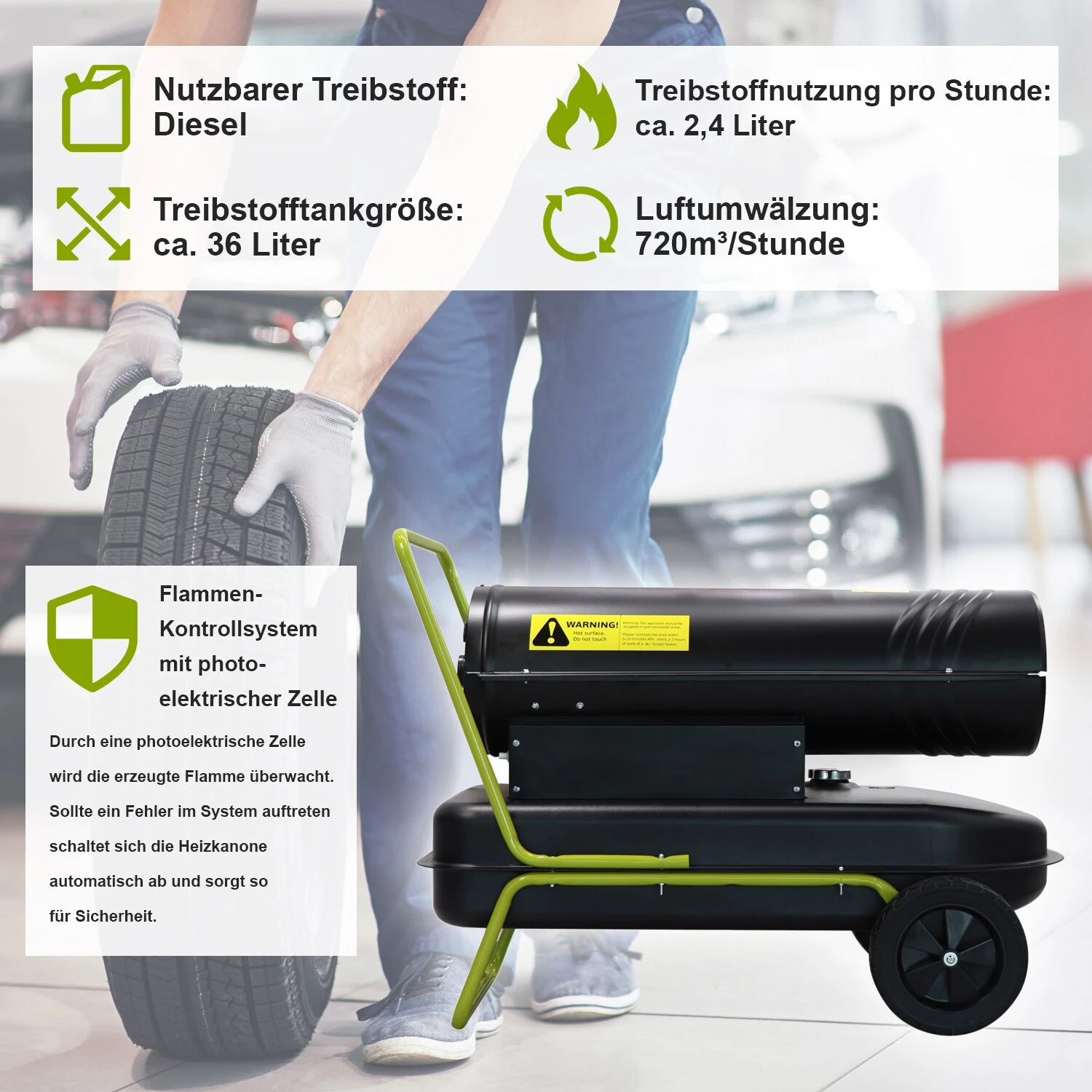 Hinweis: Dieselbetriebene Heizkanonen sind zum Heizen und Trocknen in gut belüfteten Innenräumen, z. B.: Rohbauten, oder in Außenbereichen geeignet.