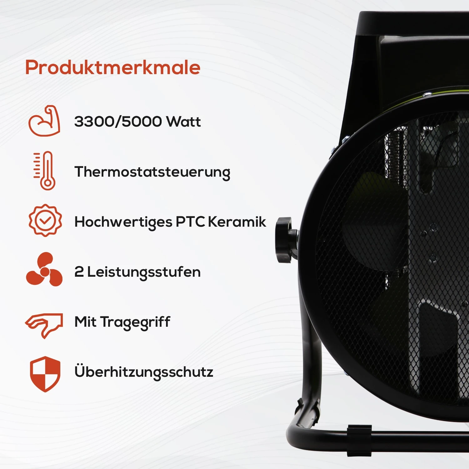 - Zwei Leistungsstufen: 3300/5000 Watt, Starkstrom