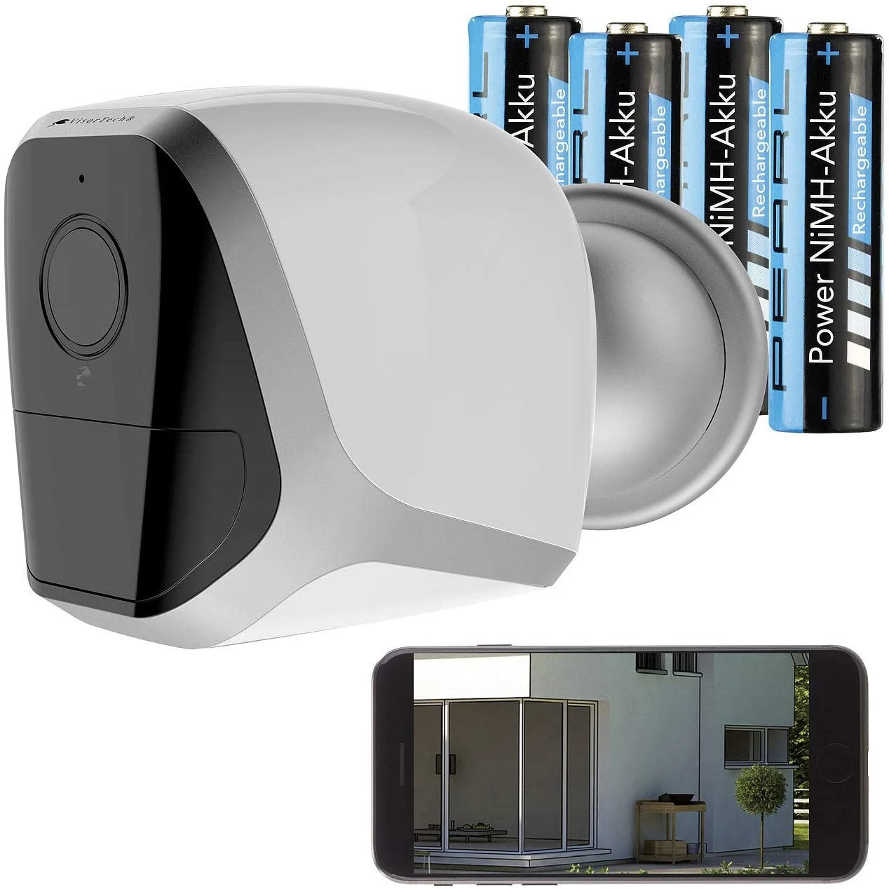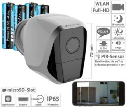 Mit der VisorTech IPC-680 Akku HD-Überwachungskamera können Sie aus aller Welt Haus und Hof im Blick behalten, sie ist somit ihr vollkommen kabelloser, flexibel aufstellbarer Wächter mit integrierter App.Dank der integrierten Akkus sind Ihnen weder Netzteil noch Kabel mehr im Weg! Auf Wunsch kann die Kamera auch solarbetrieben werden. Durch 2 PIR-Bewegungssensoren mit individuell justierbarer 3-Zonen-Überwachung wird automatisch eine Aufnahme generiert, sollte sich etwas in das Blickfeld der Kameras bewegen. Die Aufnahmen der Kamera werden auf einer Speicherkarte im Full-HD-Format gespeichert. Auch in der Nacht ist eine Überwachung dank Infrarot-Nachtsicht in einem Radius von 5 Metern möglich. Durch eine Kopplung mit der gratis verfügbaren App und WLAN, können Sie bequem von unterwegs auf die Kamera zugreifen und erhalten sogar Push-Benachrichtigungen, sollte etwas passieren. Durch das wetterfeste Gehäuse ist diese Kamera für einen Außeneinsatz an Hintertür, Lagerraum, Einfahrt u.v.m. ideal geeignet.